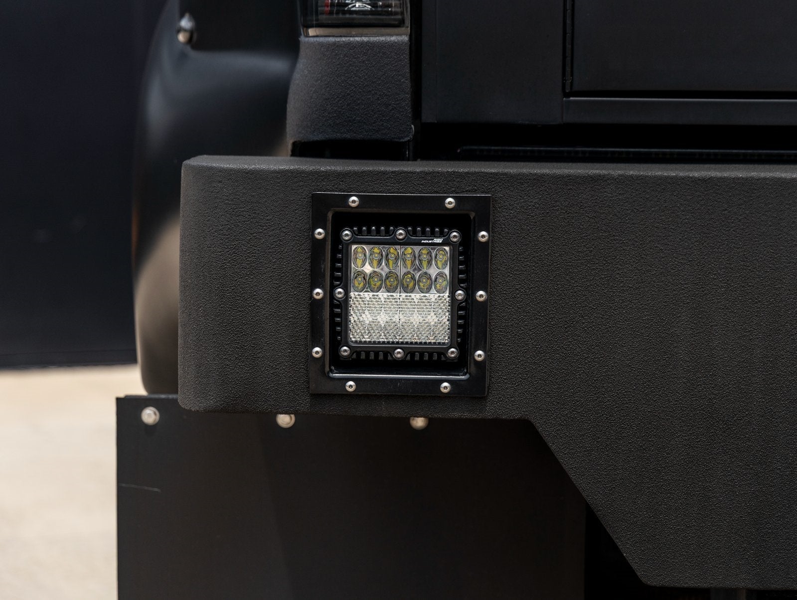 The exterior makes a commanding impression with its Harley Night Train styling package, extending across the truck, wheels, bumpers, fuel tanks, grab handles, headlight bezels, and grille. Performance upgrades include 4-Link Front Air Ride with 445/65R22.5 Super Singles, upgraded reservoir shocks, 5-inch stacks with black shields, and a 4x4 conversion. Heavy-duty enhancements such as custom 4x4 bumpers, an 18K front winch, single ram air hood, gilled hood sides, and LED lighting throughout the chassis ensure this F-650 is ready for anything. Dual 107-gallon fuel tanks, locking caps, and LineX storage boxes add practical strength.