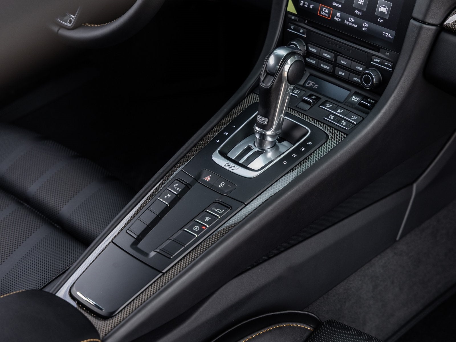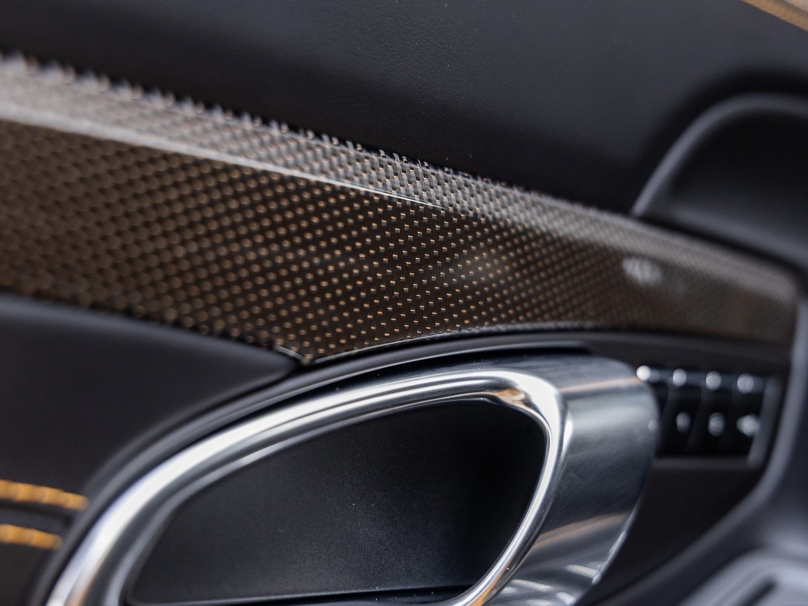 Step inside and the Leather Interior in Black with Contrasts in Golden Yellow greets you with bespoke craftsmanship from Porsche Exclusive Manufaktur. The Exclusive Manufaktur Package in Black/Golden Yellow enhances the cabin with striking contrast stitching and coordinated accents throughout. Carbon Fiber Floor Mats with Leather Edging and Fuse Box Covers in Leather further reflect the meticulous attention to detail, while Voice Control adds intuitive modern convenience to the driver-focused cockpit.