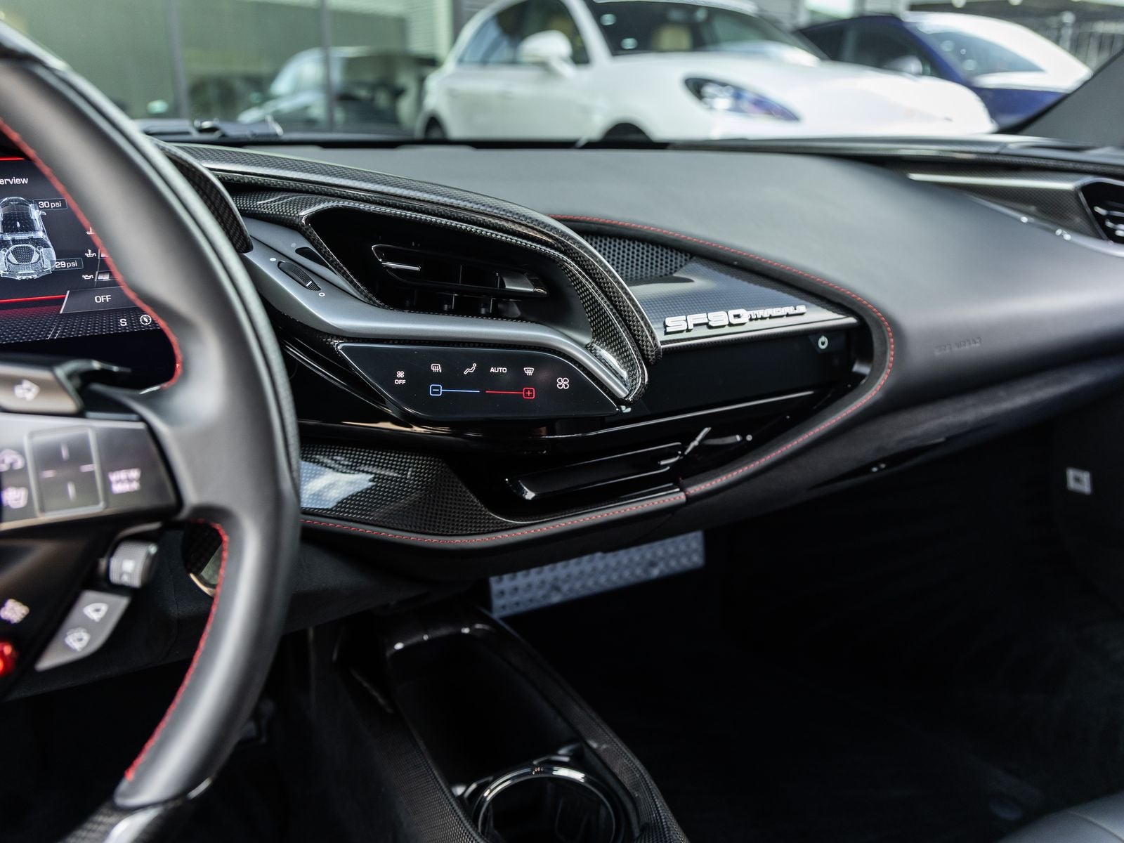 The SF90 Stradale stands as a beacon of design and performance, its Rosso Corsa exterior not just a color, but a badge of honor that reflects Ferrari's illustrious racing heritage. Adorned with 20 Forged Wheels and Carbon Fibre Front Spoiler, it presents an unmistakably aggressive stance. Carbon Fibre Side Air Splitter, Engine Covers in Carbon Fibre, and Rear Diffuser in Carbon Fibre further enhance its aerodynamic precision, while Scuderia Ferrari Shields proudly display its pedigree.