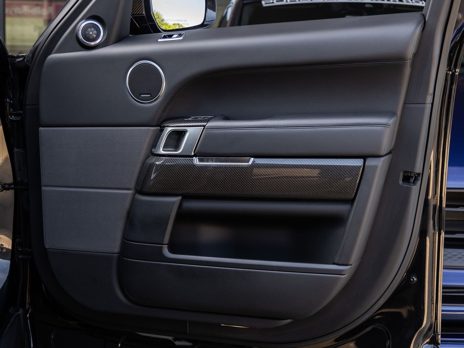 The Range Rover Sport SVR stands as a bold statement of design and performance, its Santorini Black Metallic exterior not just a color, but a reflection of refined aggression and capability. Adorned with a Carbon Fiber Hood, Carbon Fiber Door Mirrors, and Carbon Fiber Fender Vents, it presents an unmistakably sporty and commanding presence. Brake Calipers in Red add a striking contrast, reinforcing its high-performance pedigree and attention to detail.