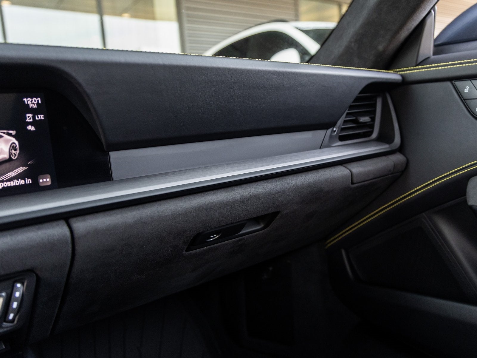 The 911 GT3s assertive stance is enhanced with the Carbon Fiber Roof and Motorsport Stripe Decal on Top in Silver, blending lightweight performance with visual flair. Exclusive features like the LED Headlights in Black including Porsche Dynamic Light System (PDLS) with accent rings in Shark Blue and Exclusive Design Taillights further elevate its presence. The Front Axle Lift System ensures practicality for everyday drives, while the Under Door Puddle Light Projectors and Exclusive Design Fuel Cap add subtle touches of distinction.