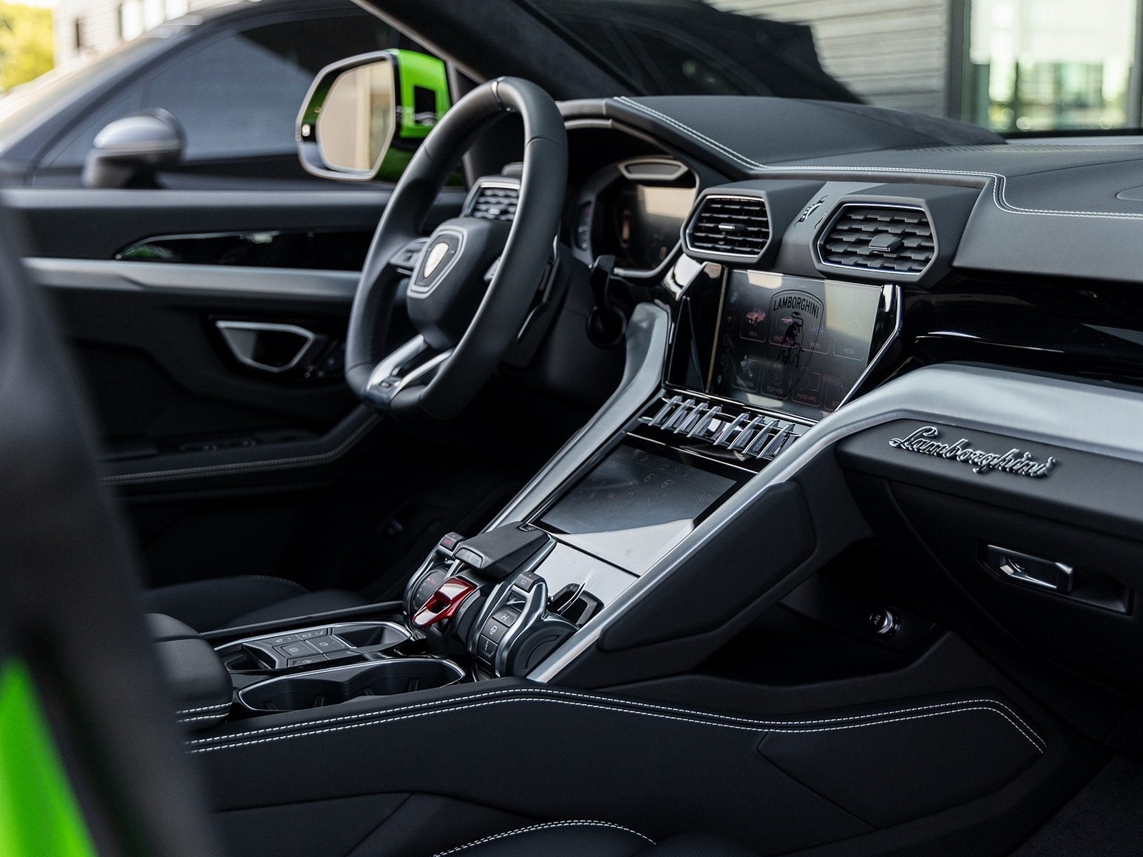Step inside and the Nero Ade leather interior greets you with unmistakable Italian craftsmanship. Highlights include the highly desirable Q-Citura on Leather, Full Electric Front Seats, and Optional Stitching, creating a cabin that is both sporty and refined. The Panoramic Roof floods the interior with natural light, while the Embroidered Lamborghini Shield and Seat Belts in Bianco Polar add touches of exclusivity and detail.
