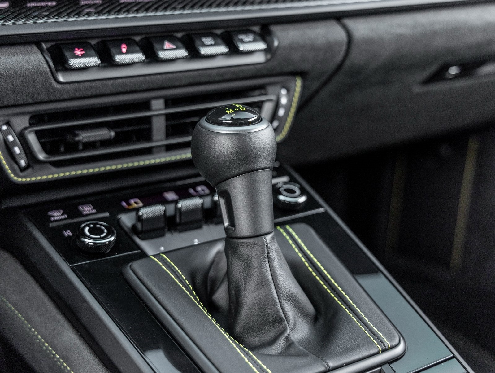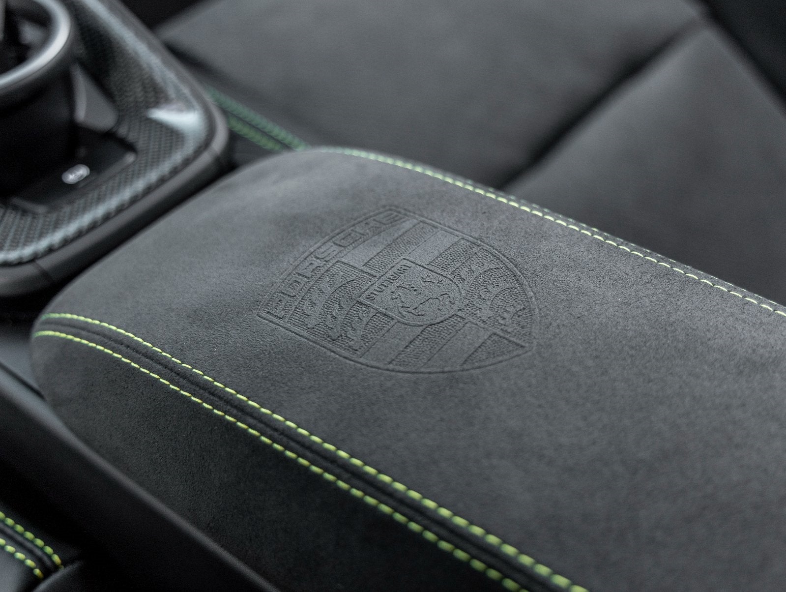 Inside, the Leather/Race-Tex Interior in Black with GT Silver Stitching delivers both comfort and motorsport influence. Highlights include Full Bucket Seats, Carbon Fiber trim, Racing Yellow deviated stitching, and BOSE Surround Sound. Touches like Air Vent Surrounds in Leather with Painted Slats, Race-Tex Sun Visors, Center Console Lid with Porsche Crest, and Personalized Floor Mats with Leather Edging reinforce the GT3s bespoke appeal.