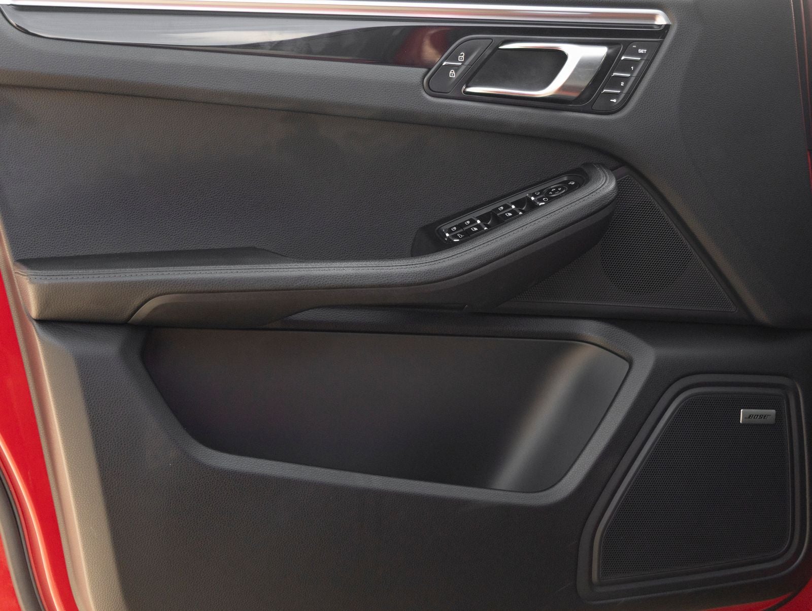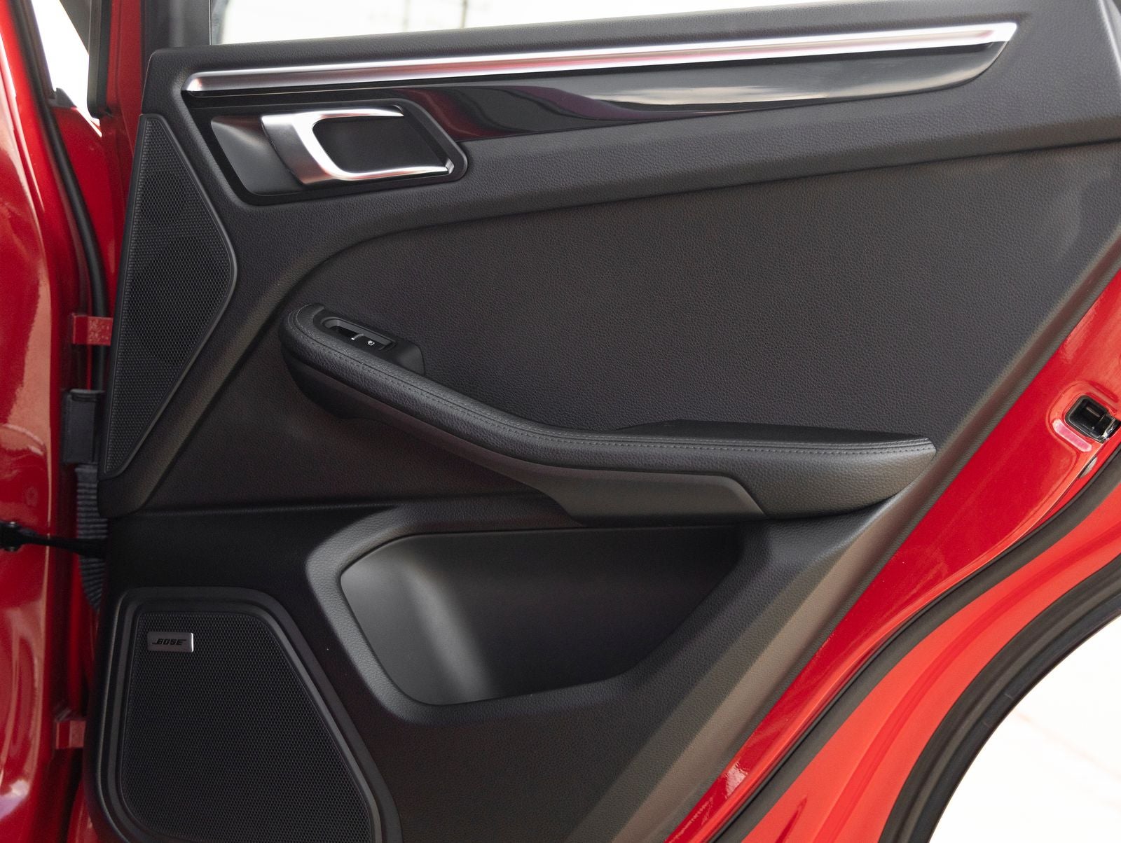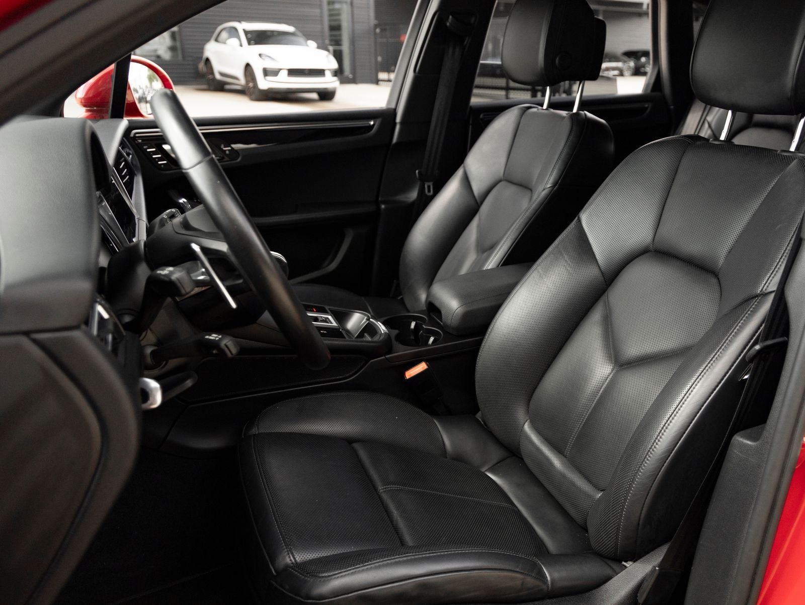 The Macan stands as a beacon of design and versatility, its Carmine Red exterior not just a color, but a bold expression of Porsches unmistakable styling. Adorned with 20 Macan S Wheels in High Gloss Black and LED Headlights including Porsche Dynamic Light System Plus (PDLS+), it presents a confident and athletic stance. The Panoramic Roof System enhances the driving experience with an open, airy feel, while Side Blades in Exterior Color and Under Door Puddle Light Projectors add distinctive finishing touches.