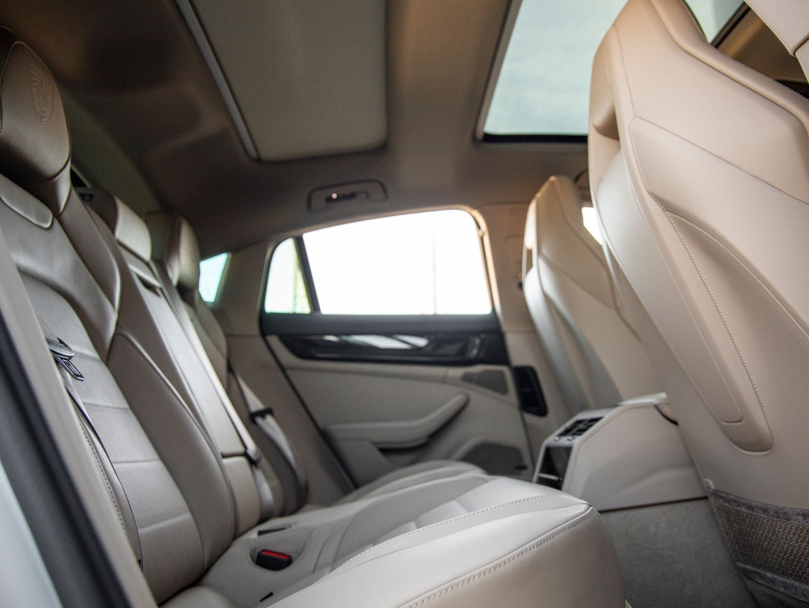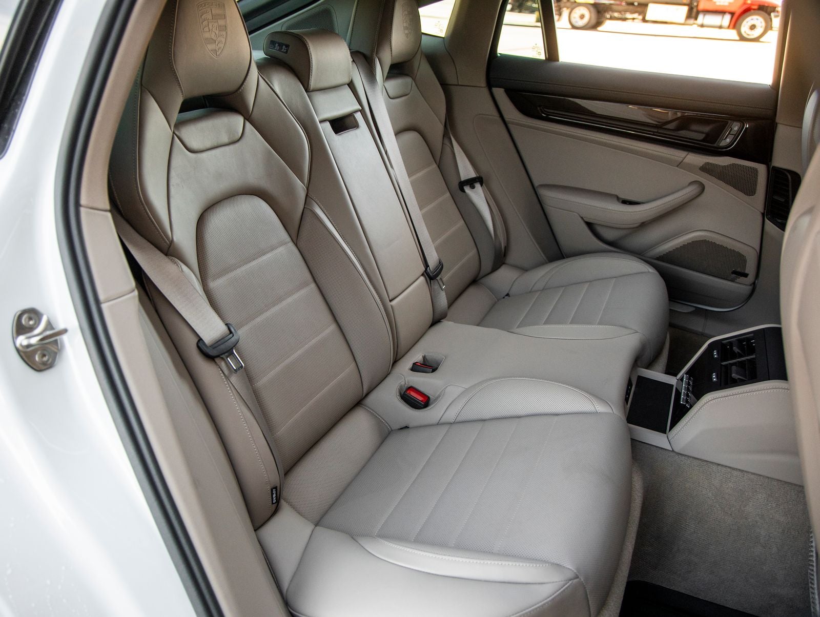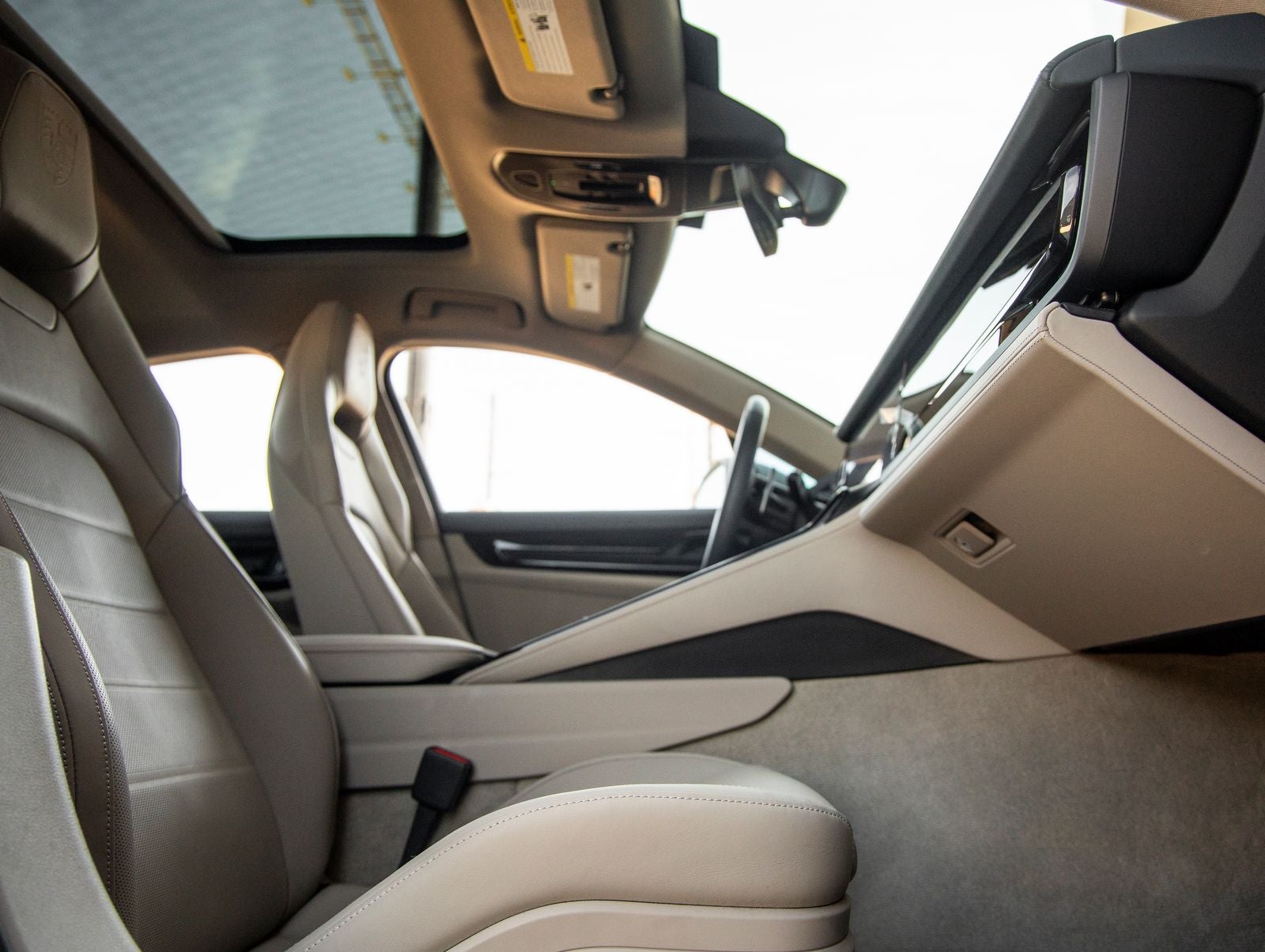 The Panamera stands as a beacon of design and performance, its Carrara White Metallic exterior not just a color, but a badge of honor that reflects Porsche's illustrious heritage. Adorned with 21-inch Panamera SportDesign Wheels painted in High Gloss Black and HD-Matrix Design LED Headlights, it presents an unmistakably commanding stance. High Gloss Black accents including the window trim, rear model designation, and PORSCHE logo enhance its sleek and modern aesthetic, while Exclusive Design Taillights and Sport Tailpipes in Dark Bronze further elevate its dynamic presence.