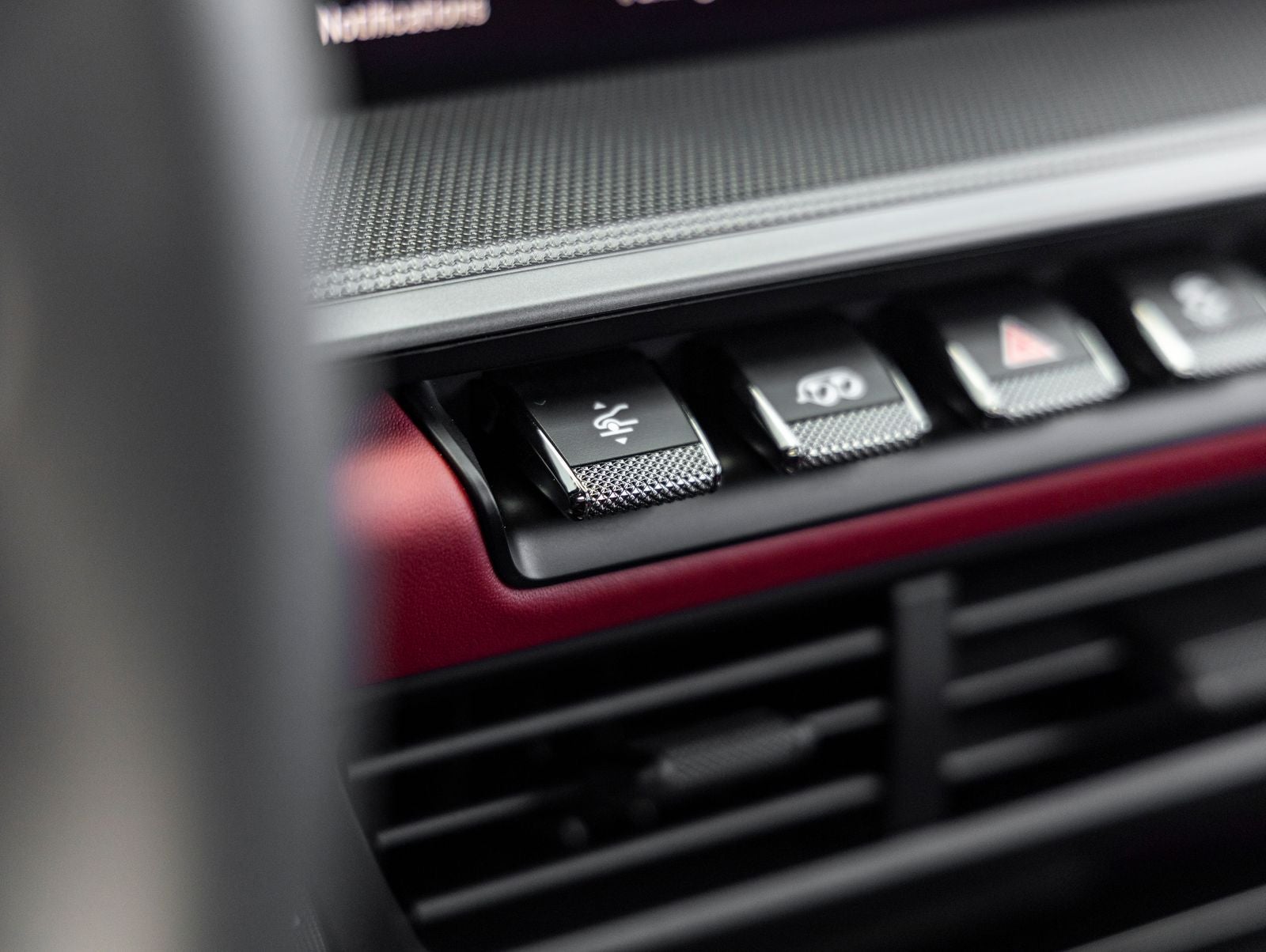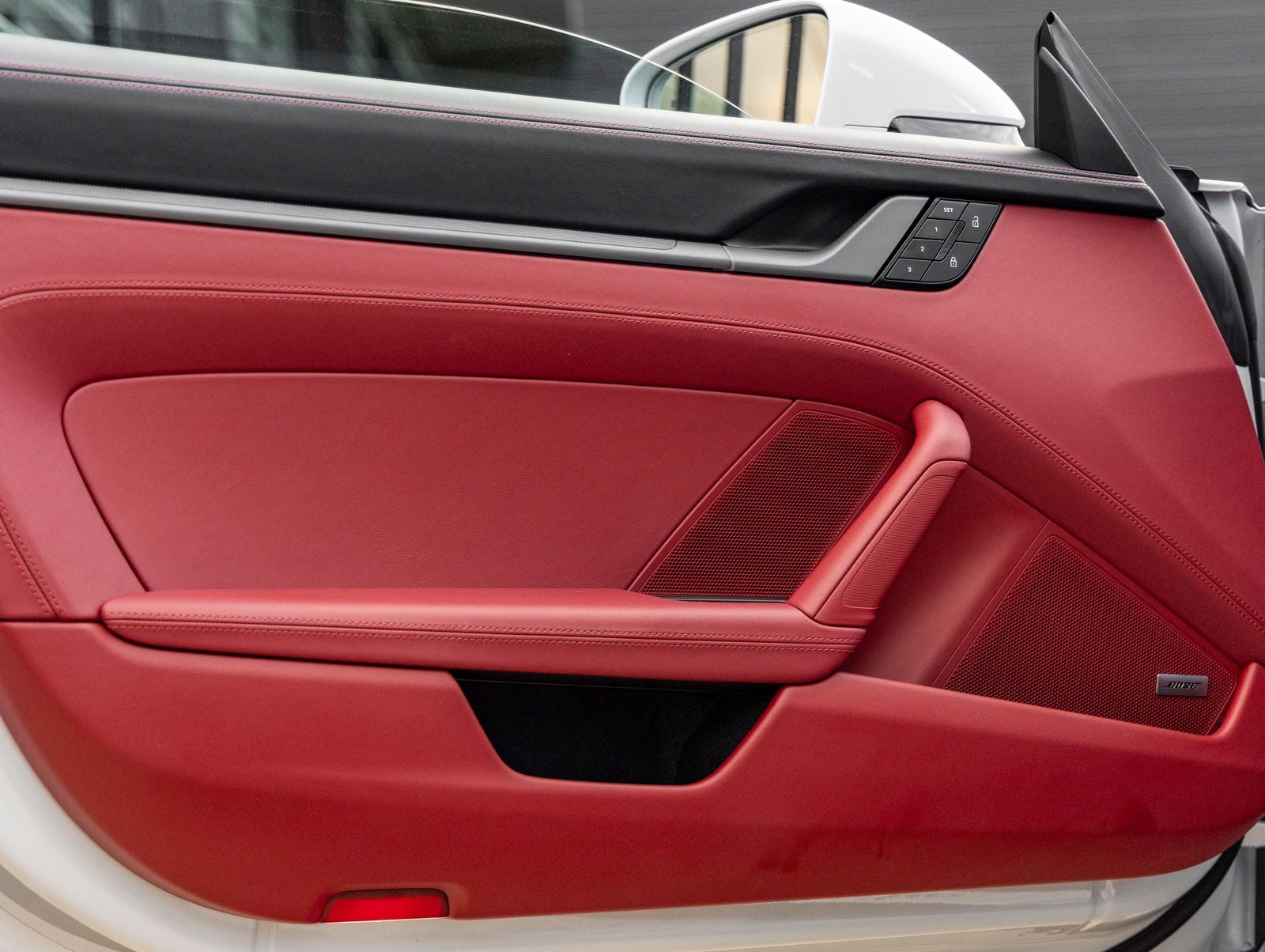 Step inside and the Black/Bordeaux Red Leather interior greets you, exuding an air of luxury that only Porsche can deliver. The Power Sport Seats (14-way) with Memory Package ensure optimal comfort, while the Heated GT Sport Steering Wheel in Leather and Porsche Crest on Headrests elevate the cabins exclusivity. ium touches such as the BOSE Surround Sound System, Ambient Lighting from the Premium Package, and a refined PDK Gear Selector in Aluminum complete the driver-focused environment.