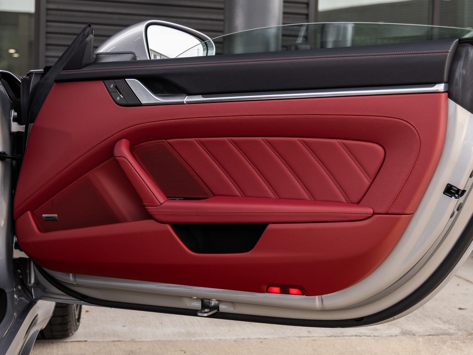Step inside and the Leather Interior in Black/Bordeaux Red greets you with unmistakable Porsche craftsmanship. Adaptive Sport Seats Plus (18-way) with Memory Package provide exceptional comfort and support, complemented by a Heated GT Sport Steering Wheel in Leather. The 930 Leather Package, Interior Trim Inlays in Leather with Light Silver accents, and Center Console Lid with Model Designation elevate the cabins bespoke feel. Ventilated Front Seats, BOSE Surround Sound System, Porsche Crests on Headrests, and Under Door Puddle Light Projectors complete the refined yet performance-focused interior.
