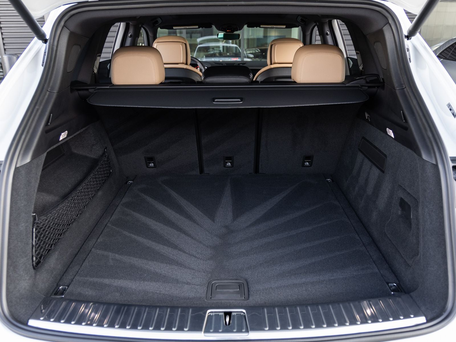 The Cayennes bold White finish complements its muscular stance, further accentuated by the distinctive 21 RS Spyder Design Wheels and Window Trim in High Gloss Black. The Panoramic Roof System offers a breathtaking view, allowing natural light to flood the cabin, while Under Door Puddle Light Projectors add a refined touch to nighttime arrivals.