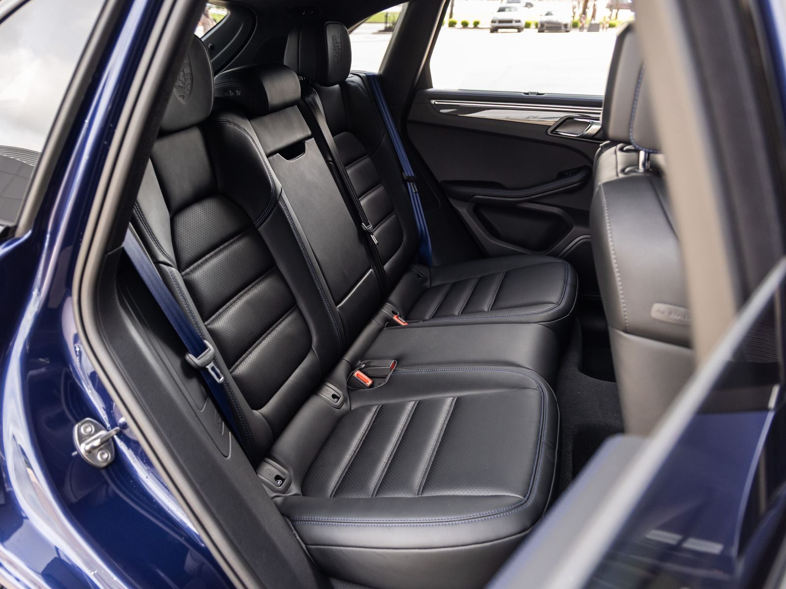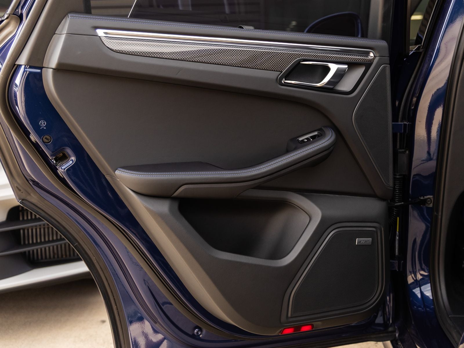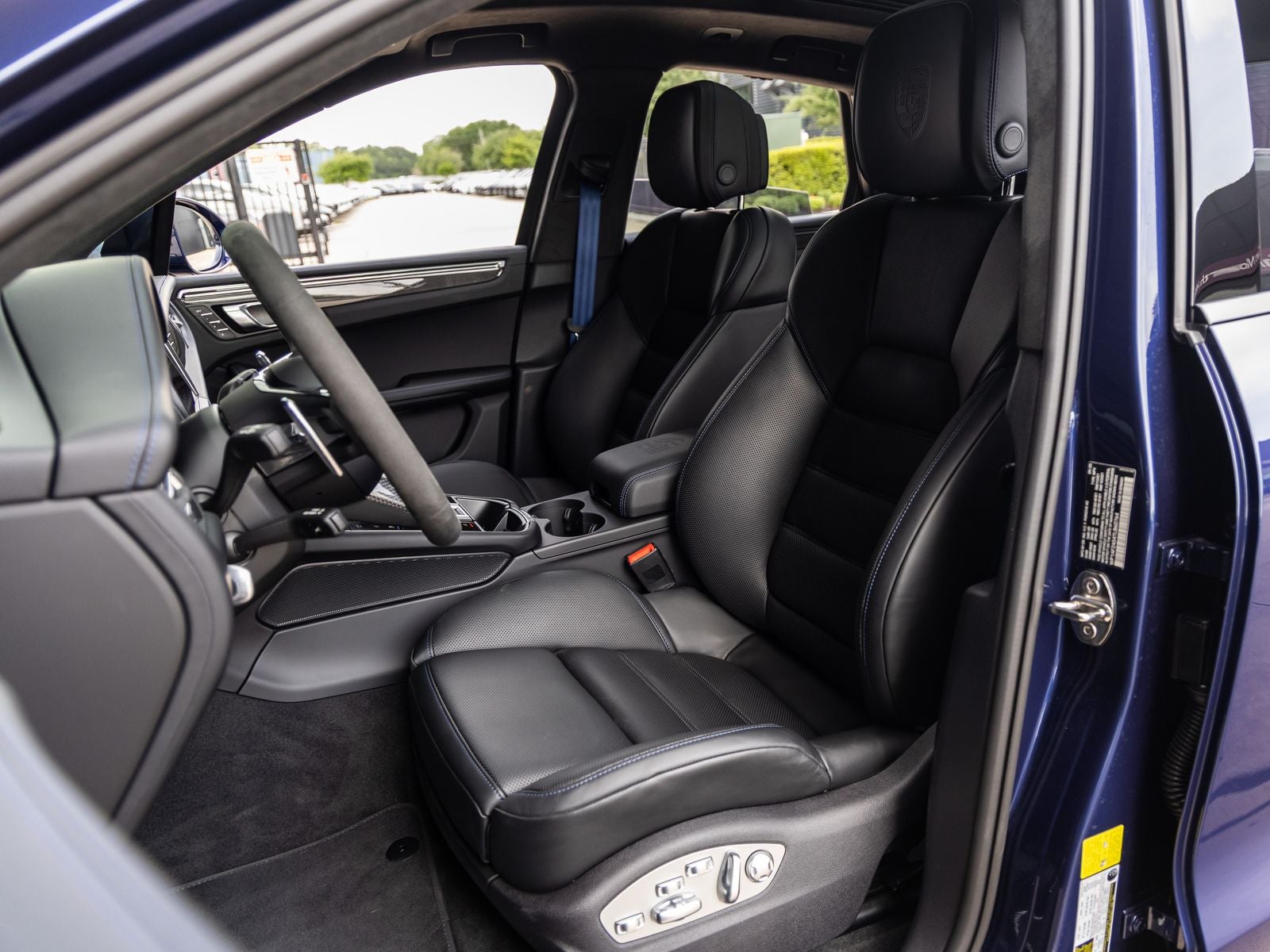 The Macan GTS stands as a beacon of design and performance, its Gentian Blue Metallic exterior not just a color, but a bold expression of Porsches sporting heritage. Adorned with LED Headlights in Black including Porsche Dynamic Light System Plus (PDLS+), 21-inch wheels, and High Gloss Black accents, it presents a dynamic and aggressive stance. The Sport Chrono Package and exclusive design elements, including carbon fiber accents and red model designation details, further elevate its athletic character.